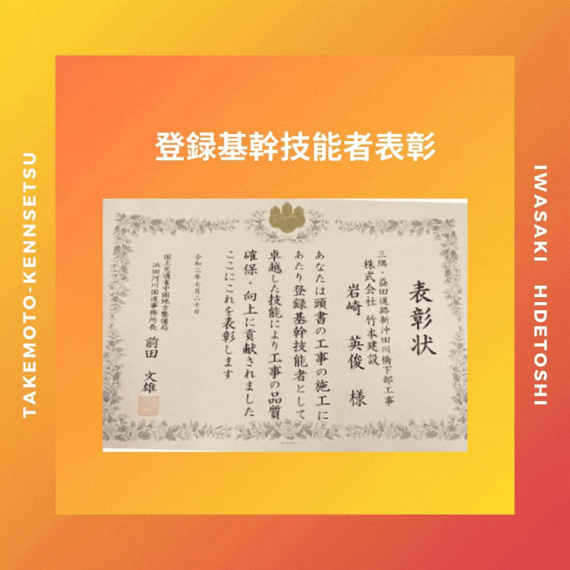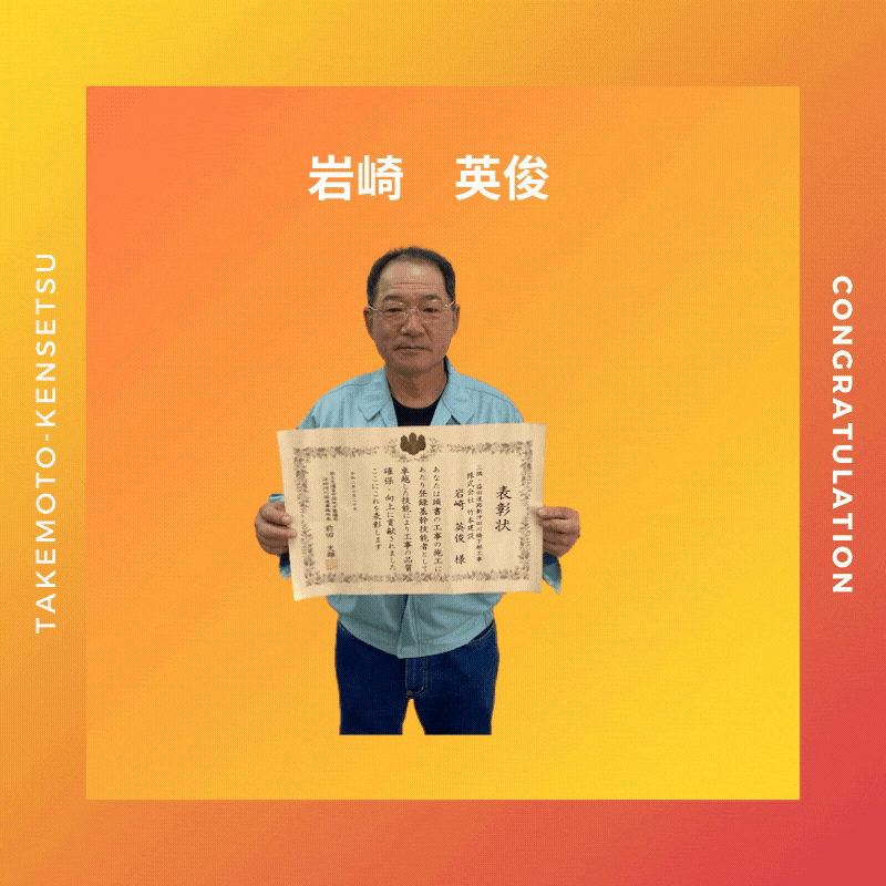 基幹技能士表彰を頂きました。受賞者は株式会社竹本建設所属の